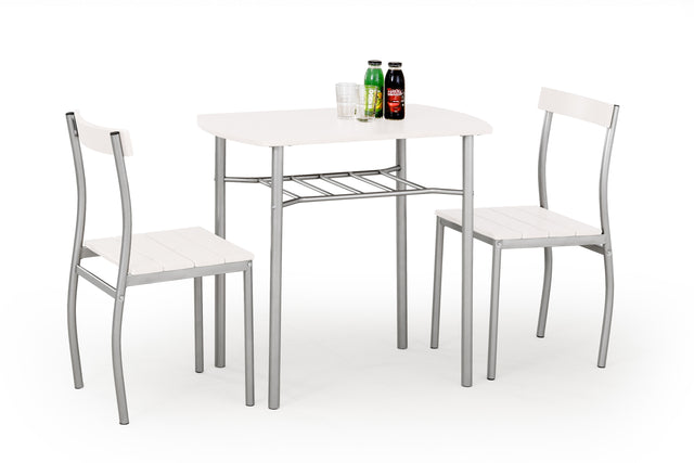 stalo matmenys: 82/50/75 cm, medžiaga: stalviršis ir kėdžių sėdynės - laminuotas MDF, rėmai - milteliniu būdu dažytas plienas, spalva: balta