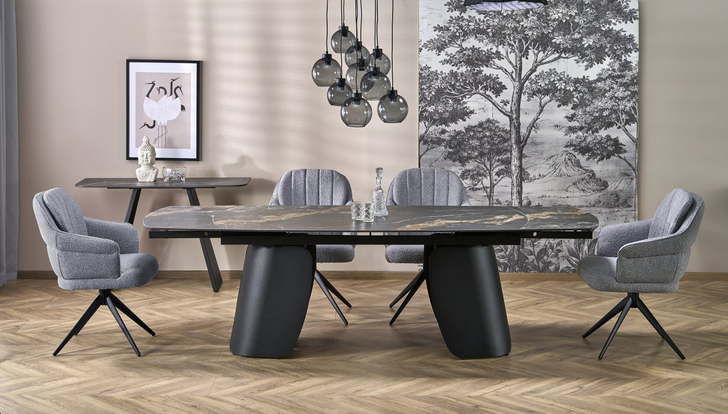 dimensions: 180-260/90/76 cml, extension table, material: sintered stone / powder coated steel, color: top - black marble, legs - black