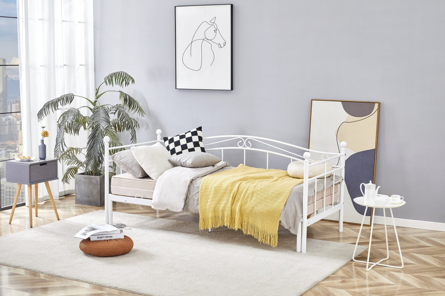 double bed with pull-out extra mattress space, material: powder coated steel, color: white ,* bed without mattresses, optional mattresses PIZA