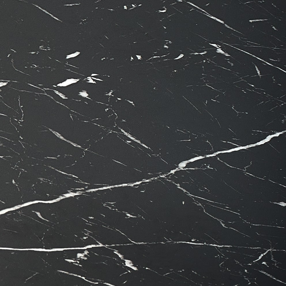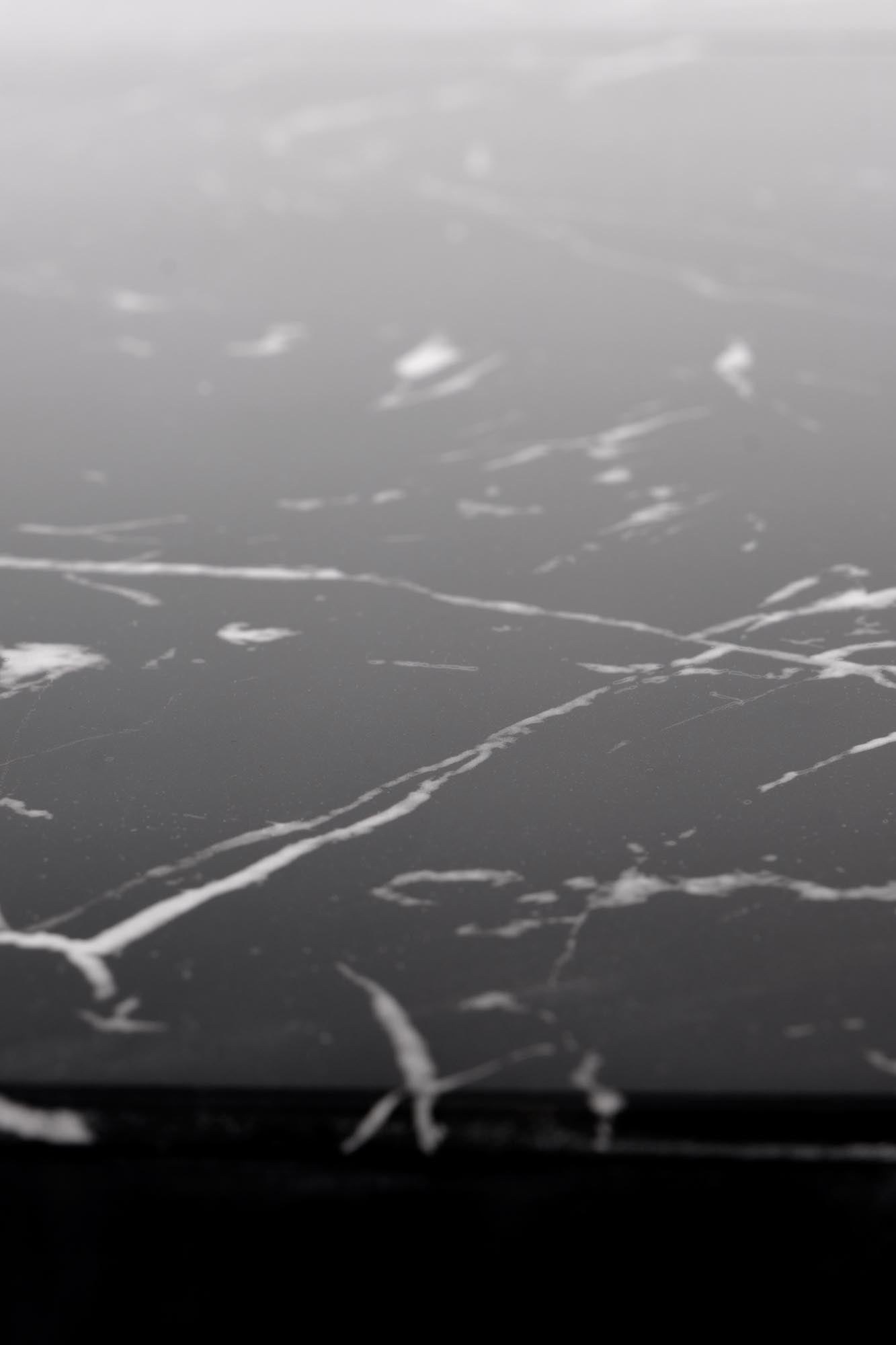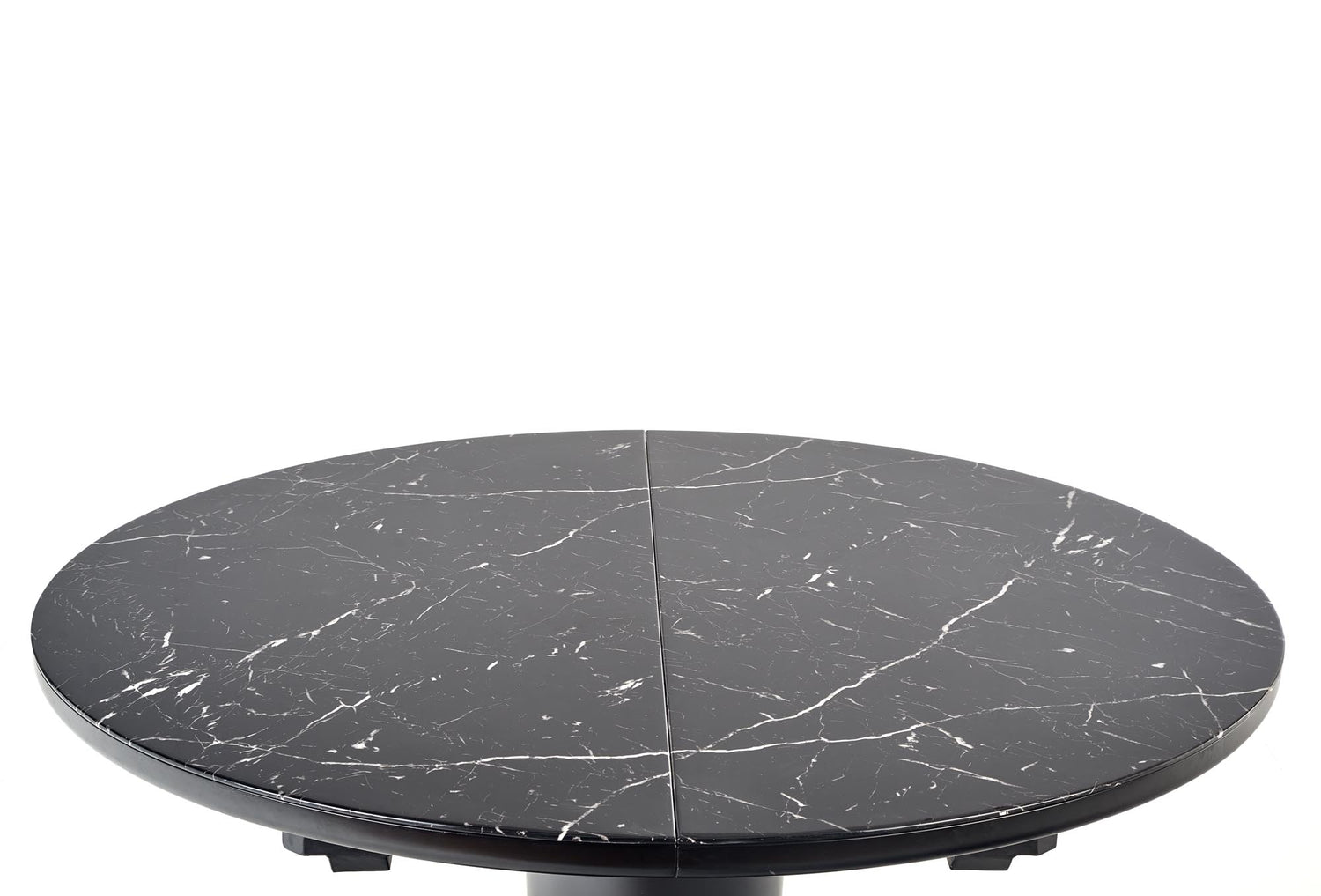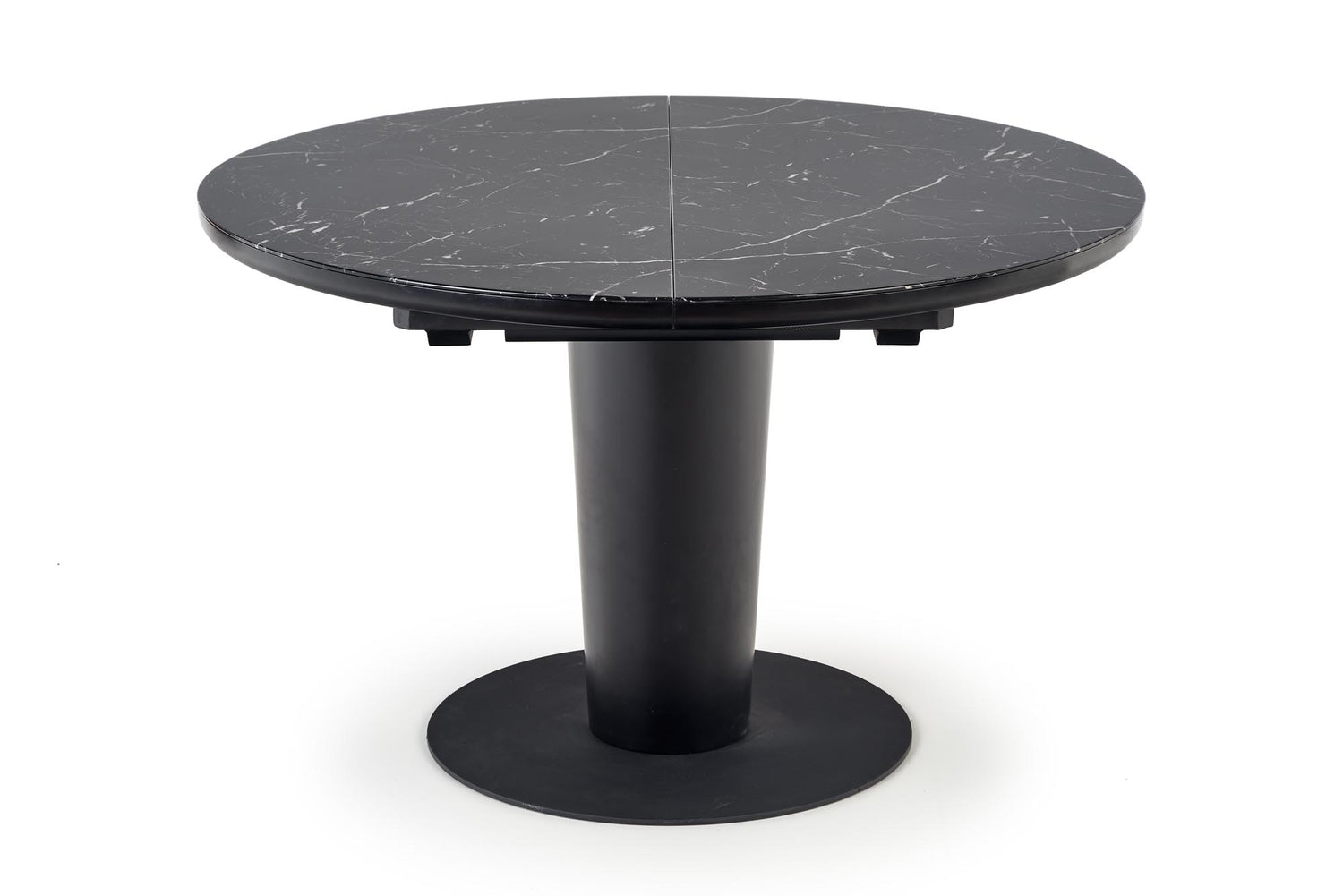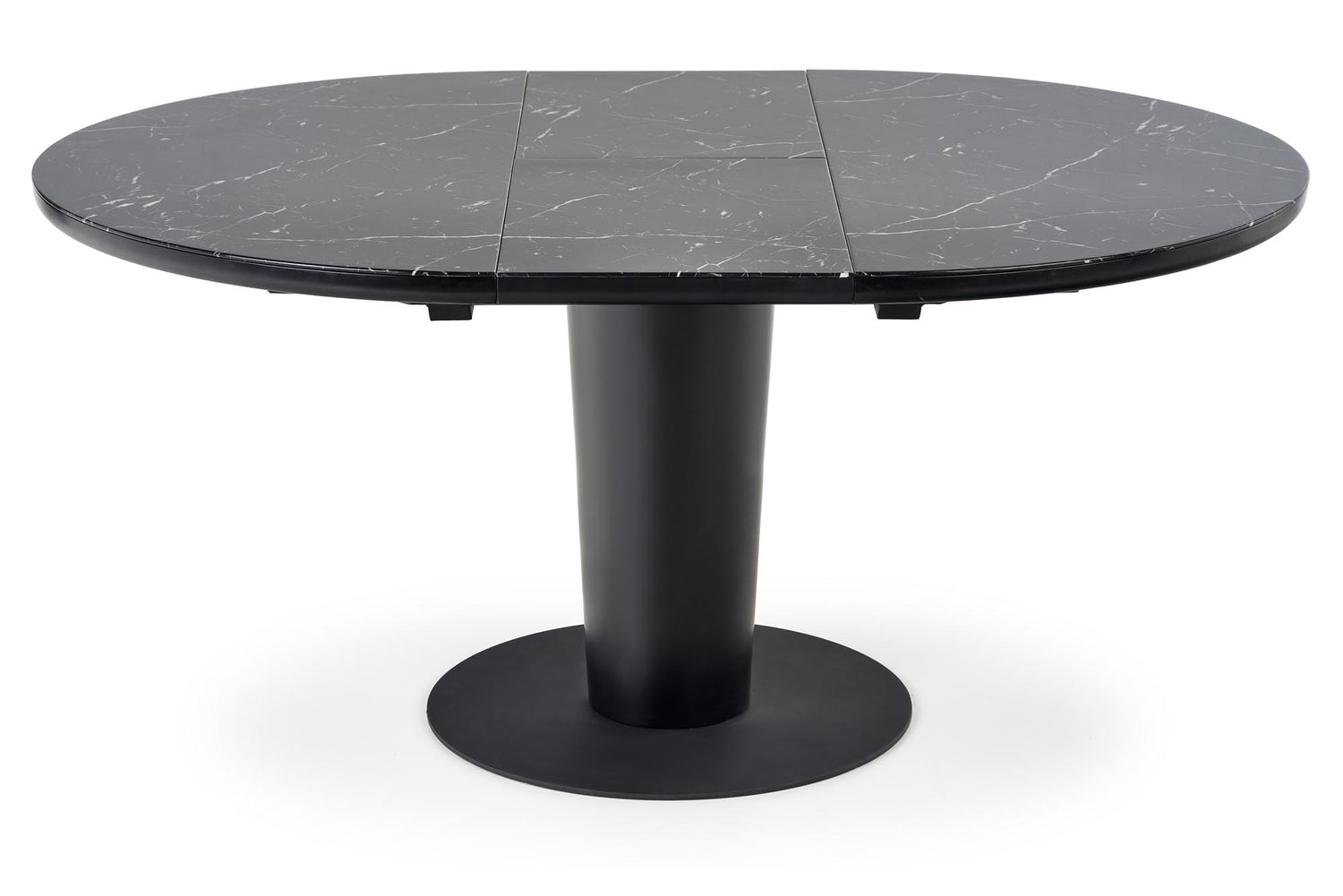 matmenys: 120-160/120/75 cm, prailginamas stalas, medžiaga: stiklas / lakuotas MDF / milteliniu būdu dažytas plienas, spalva: viršus - juodas marmuras, kojos - juodos