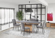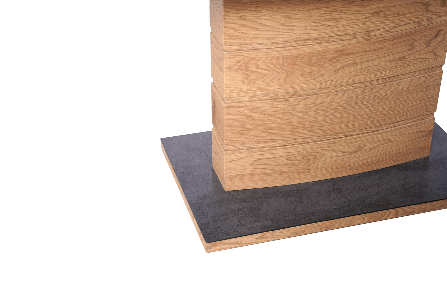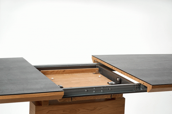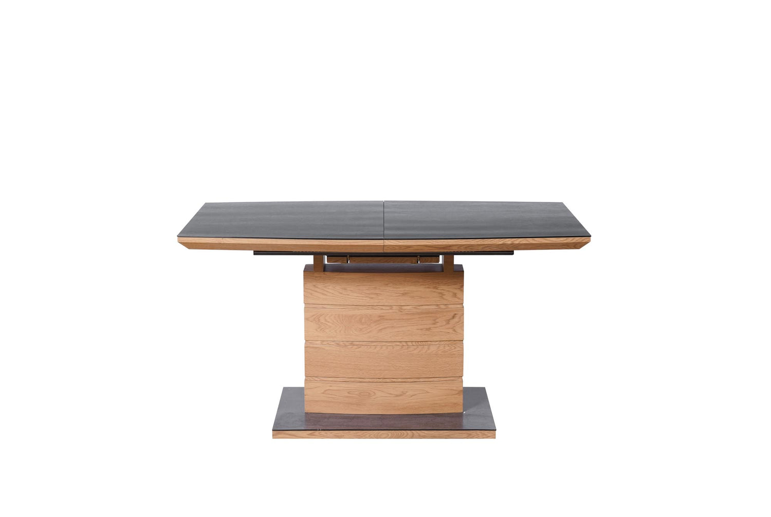 prailginamasis stalas, matmenys: 140÷180/80/77 cm, medžiaga: stiklas / laminuotas MDF, spalva: viršus - tamsiai pilka, koja - auksinis ąžuolas