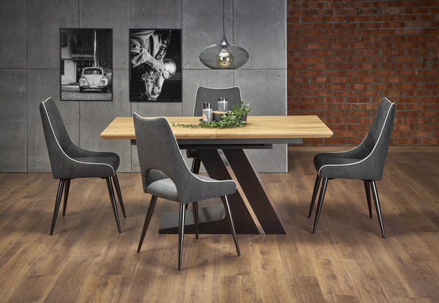 matmenys: 160-220/90/75 cm, prailginamas stalas, medžiaga: laminuotas MDF / milteliniu būdu dažytas plienas, spalva: viršus - natūralus ąžuolas, kojos - juodos