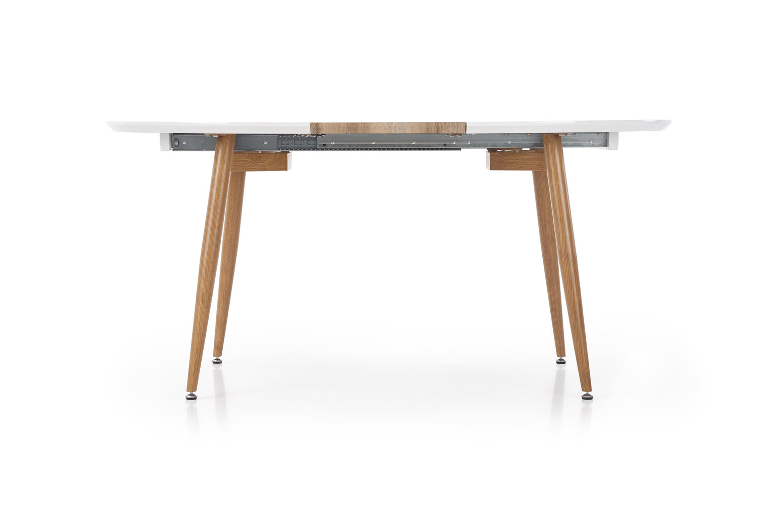 prailginamasis stalas, matmenys: 120-200/100/75 cm, medžiaga: lakuotas MDF / laminuotas MDF / dažytas plienas, spalva: viršus - baltas / medaus ąžuolas, kojos - medaus ąžuolas