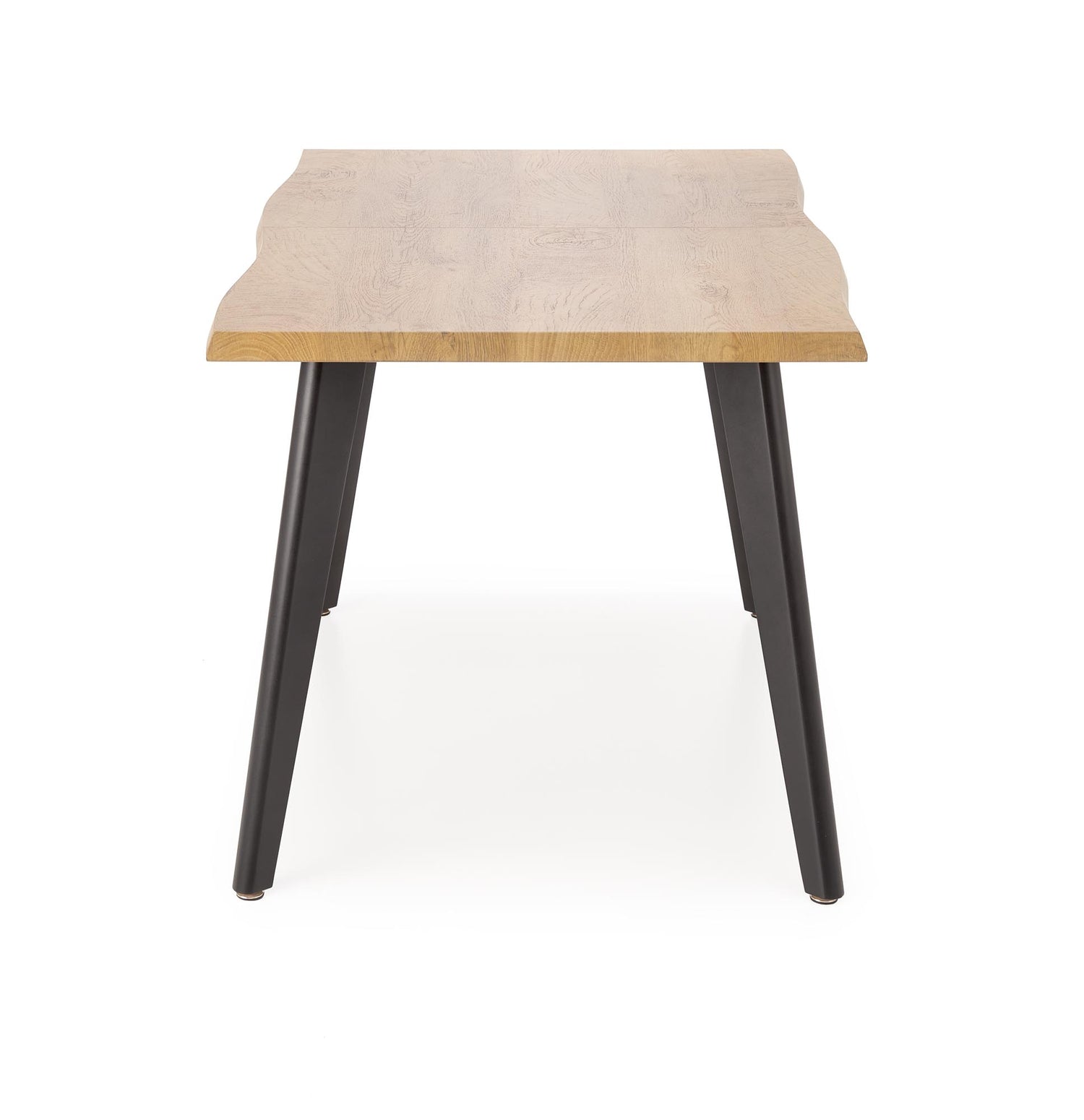 matmenys: 150-210/90/75 cm, prailginamasis stalas, medžiaga: MDF + natūrali fanera, spalva: viršus - natūralus ąžuolas, kojos - juodos Išpylus skysčius ant stalviršio, nedelsdami nušluostykite, kad neįsigertų vanduo pagal stalviršio medžiagą