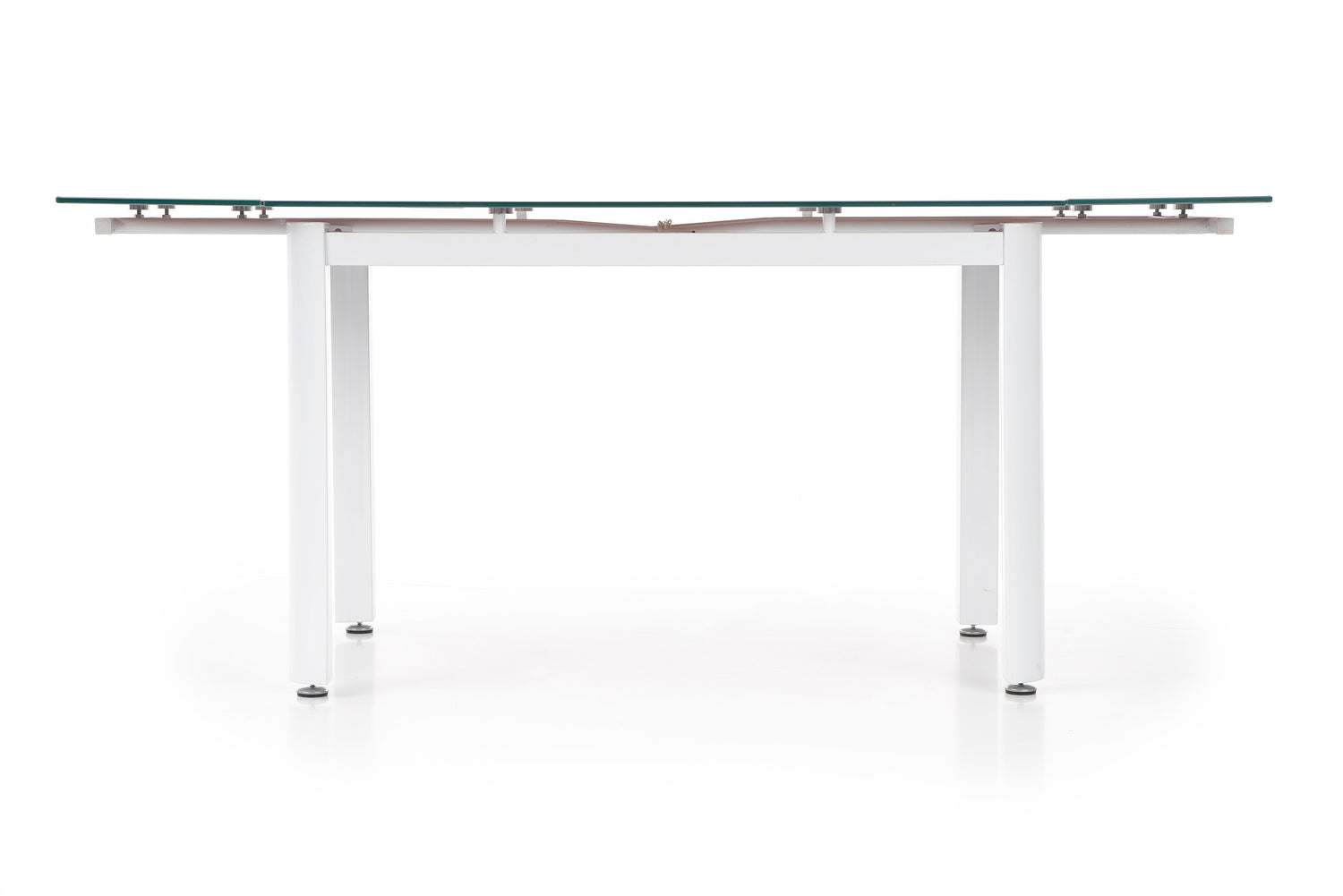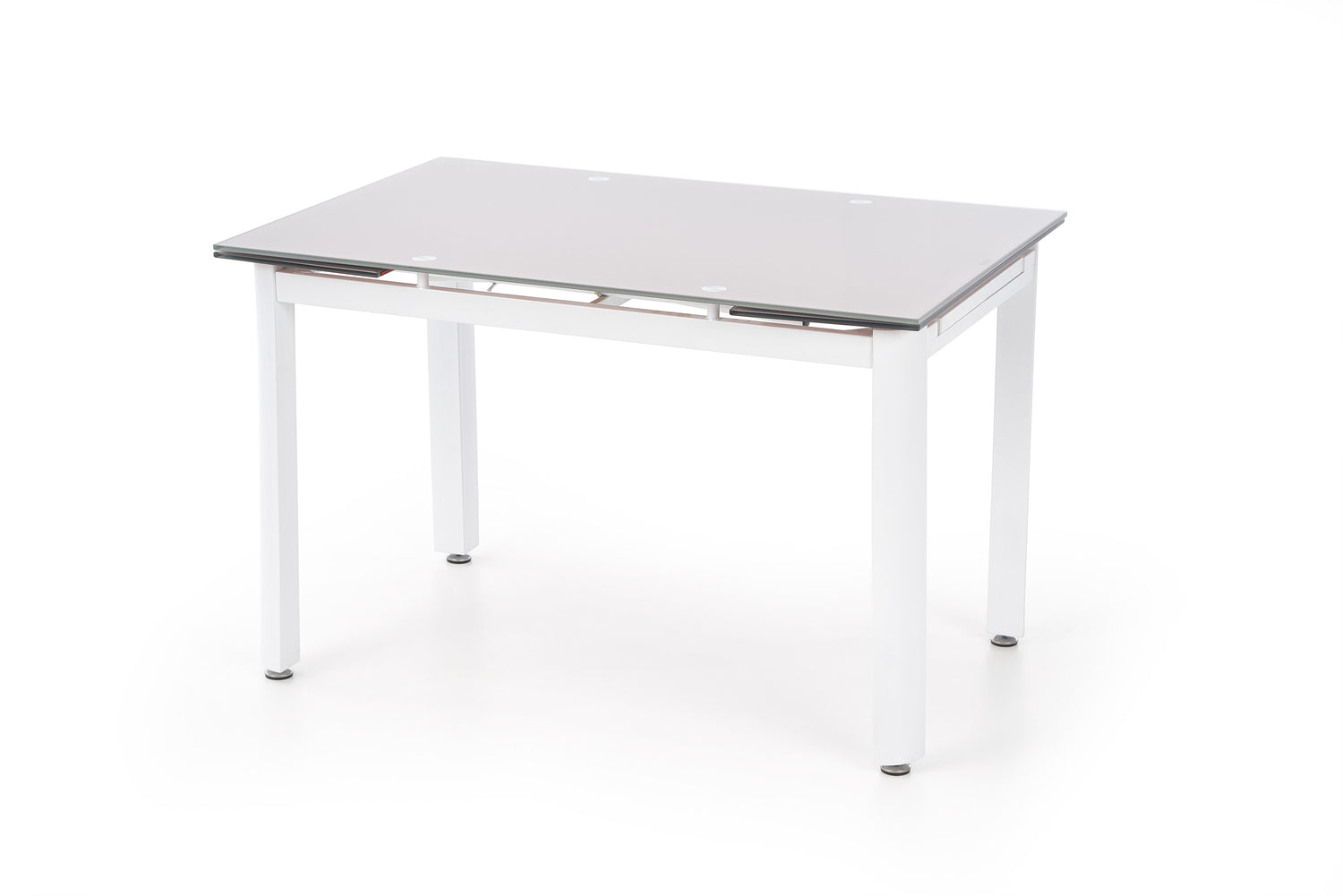 prailginimo stalas, matmenys: 120÷180/80/75 cm, medžiaga: stiklas / dažytas plienas, spalva: stiklas - smėlio spalvos, rėmas - baltas